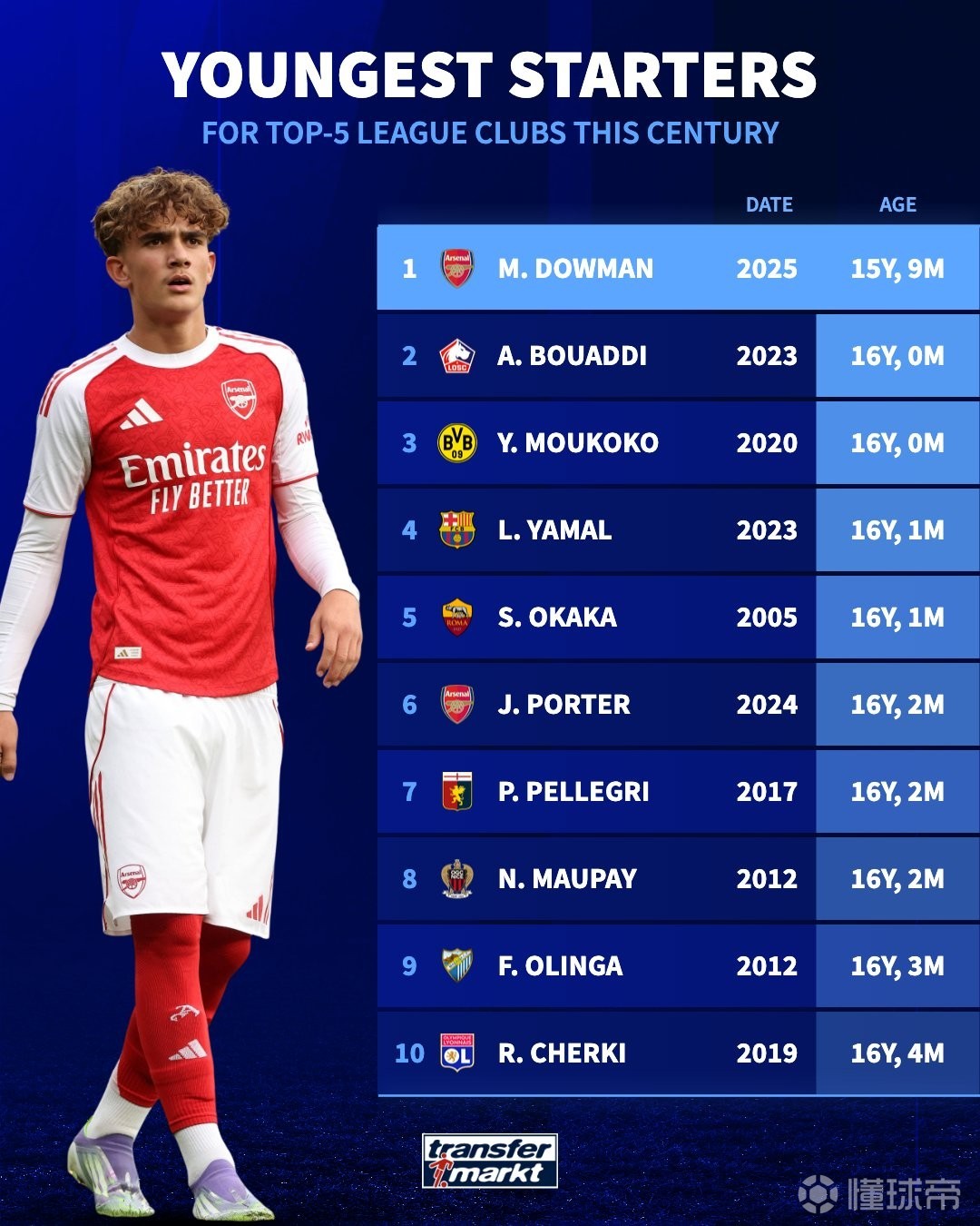 本世纪五大联赛最年轻首发前十:道曼第一,亚马尔第四
